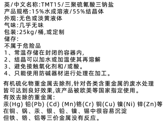 TMT-15是一种高科技水处理药剂,外文名为tmt-15,CAS登录号为17766-26-6,外观呈淡黄色液体,主要成分为三巯基三嗪三钠盐。该药剂能在常温下与废水中的汞、铅、铜、镉等重金属离子迅速反应,生成不溶于水且化学性质稳定的螯合物,从而实现重金属去除,可作为进口同类产品的替代品。